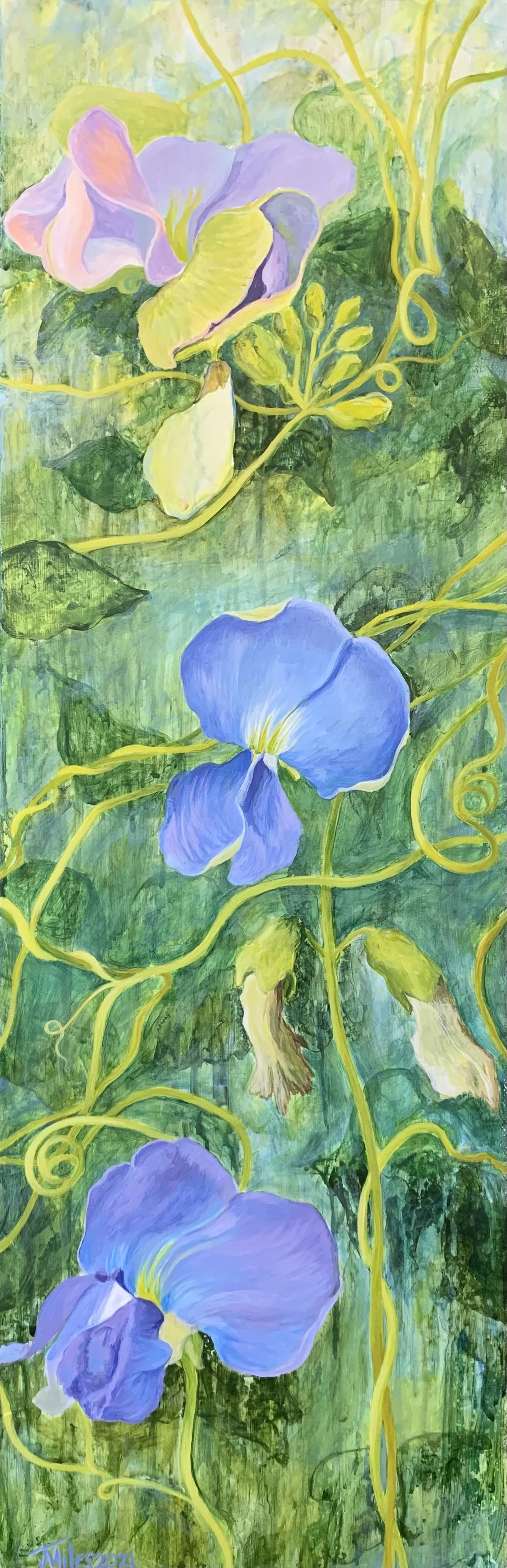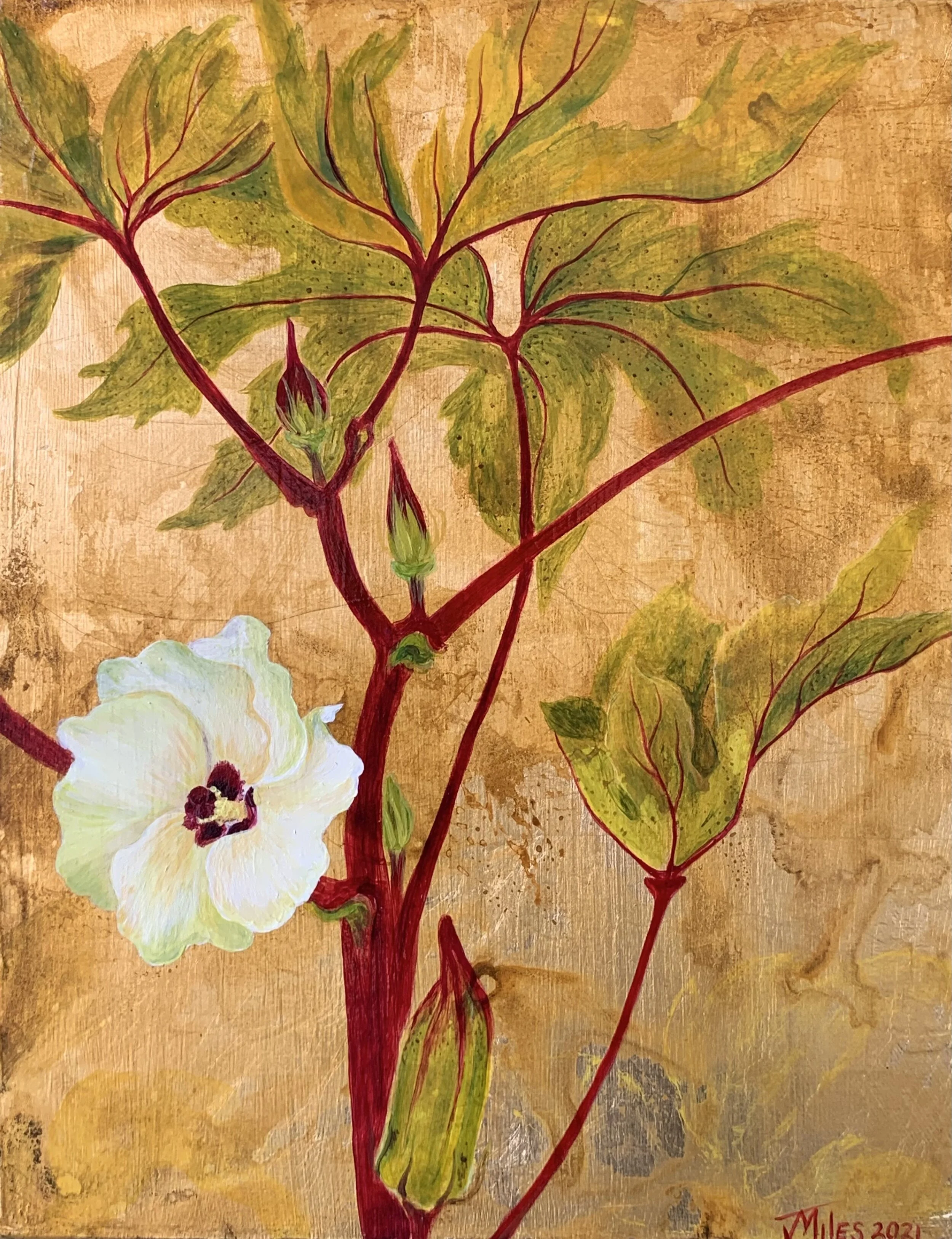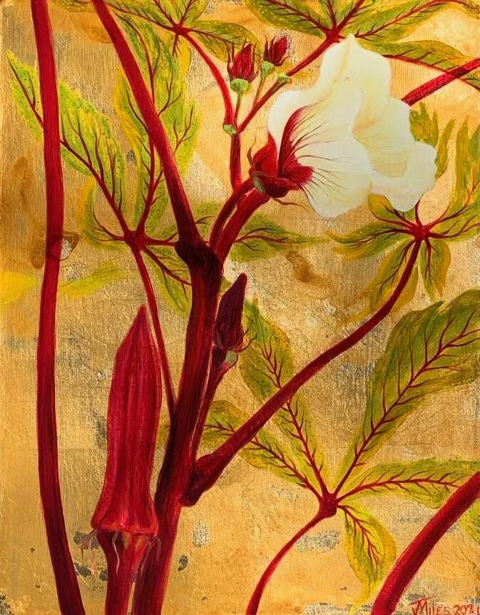 The Homegrown series is a celebration of growth, nourishment, and the quiet abundance found in the everyday garden. Drawing inspiration from home cultivation, these works illuminate the elegance of familiar plants—okra, peas, and blossoms—rendered with reverence and intimacy. Gold-leaf backdrops and layered hues elevate these humble subjects, transforming them into emblems of resilience and beauty. Through rich color and tender observation, the series honors the cycles of planting, tending, and harvest, revealing the sacred artistry that lives within the natural rhythms of homegrown life.